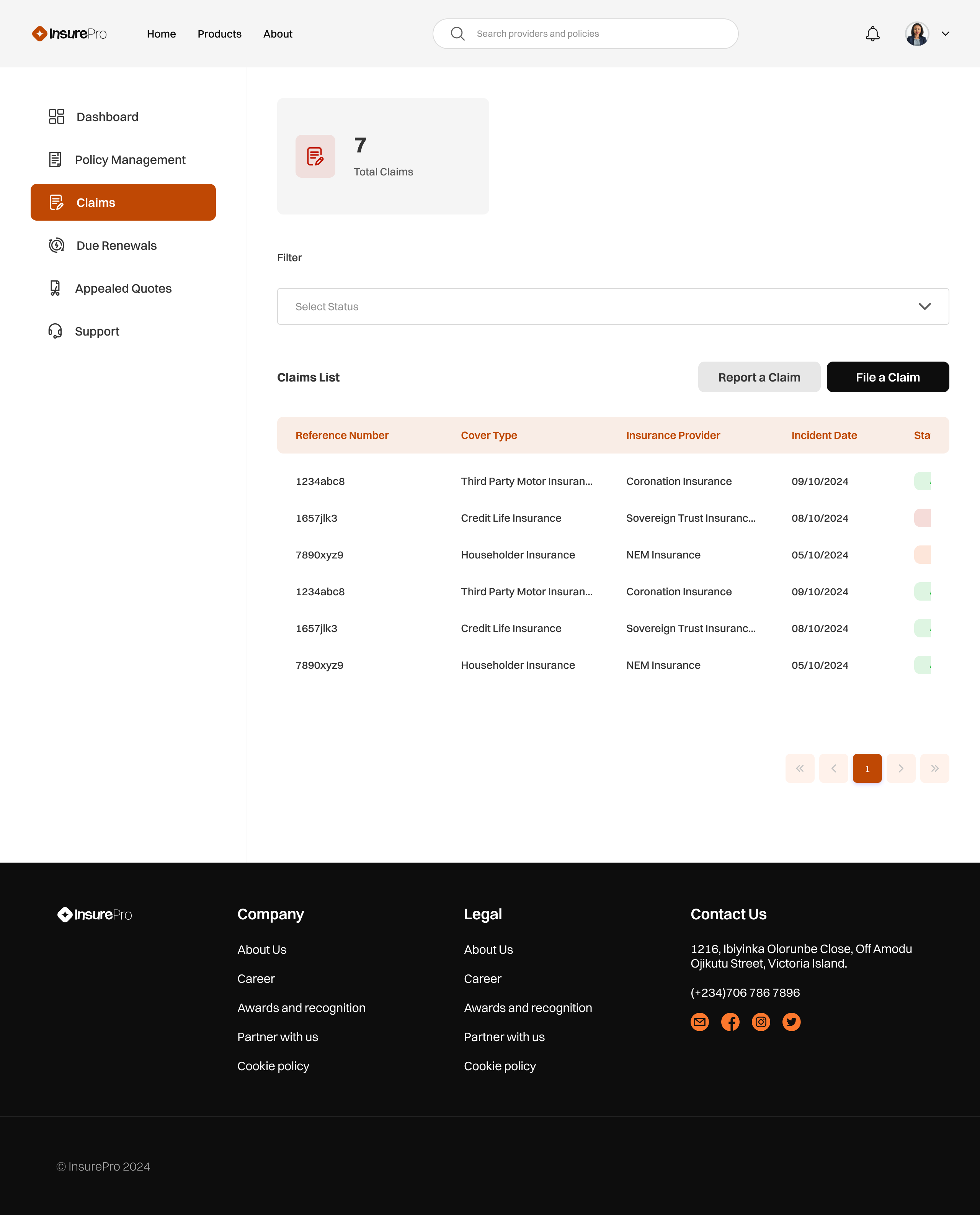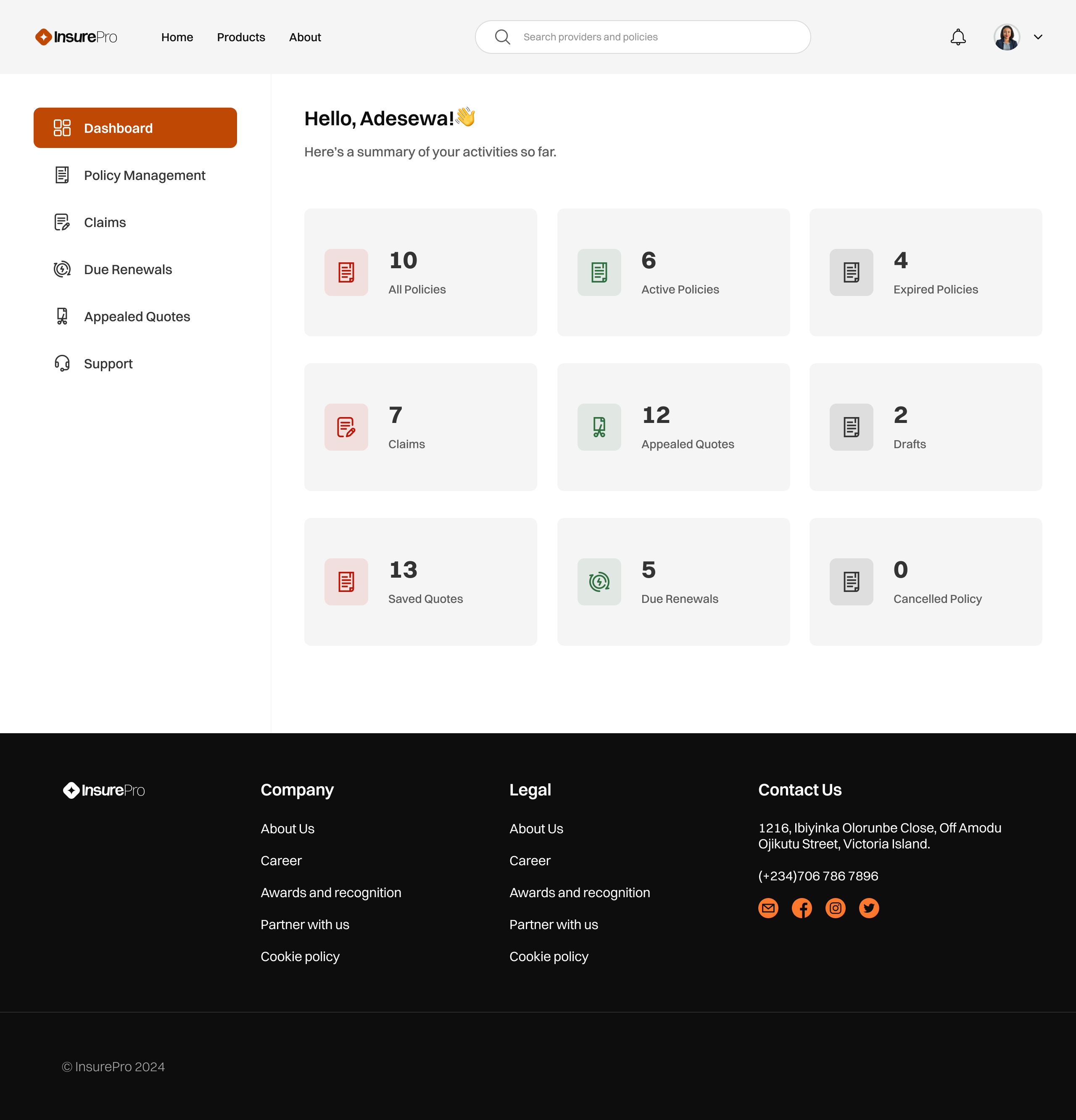 - Dashboard Overview: View active policies, claims status, and saved quotes at a glance