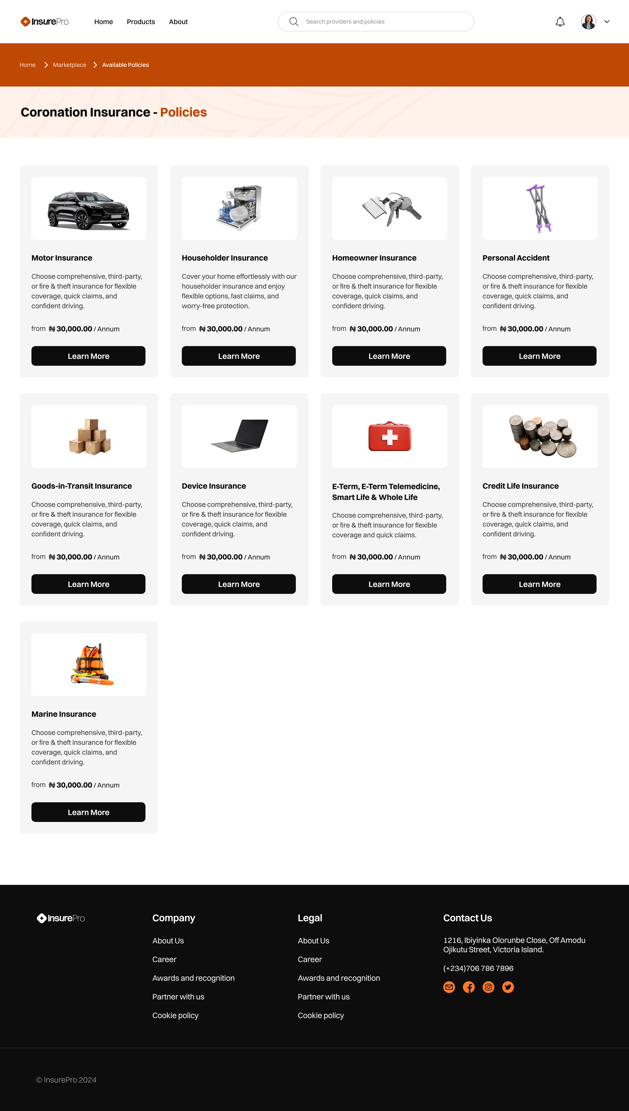 - Insurance Marketplace: Browse and purchase from 8 policy types with advanced filtering
