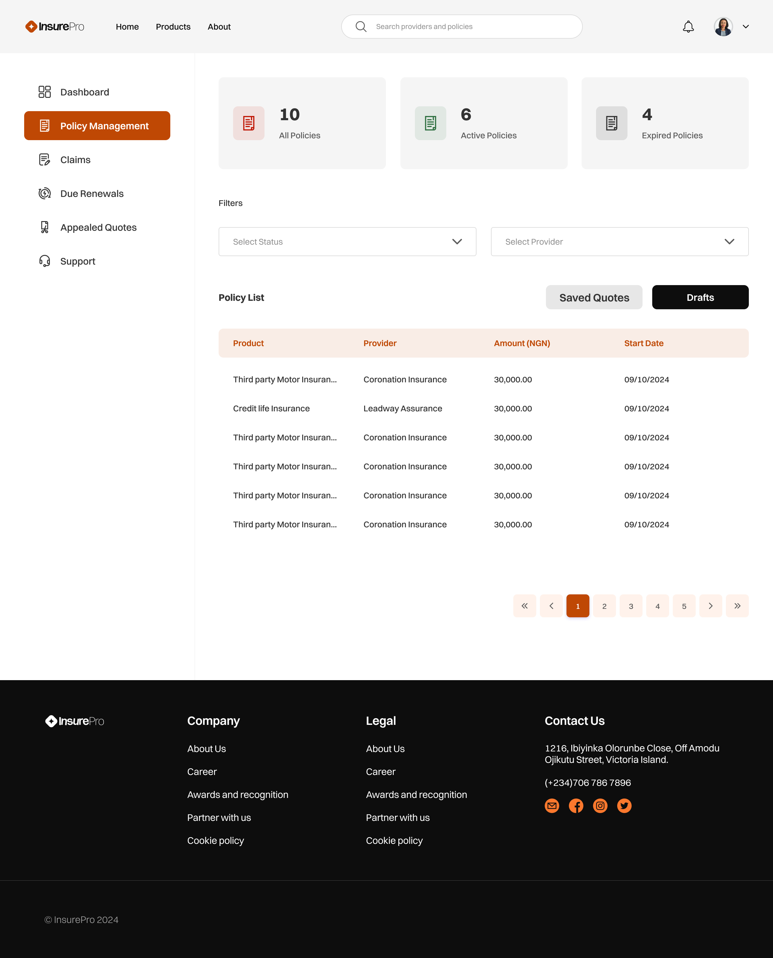 - Policy Management: Track, view, cancel, and renew insurance policies with table-based interface